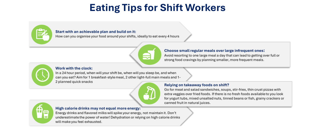 Staying alert, focused and safe while on shift relies on your brain and body getting enough energy; through food! For this reason, eating patterns play a crucial role in your health and ability to do your job.